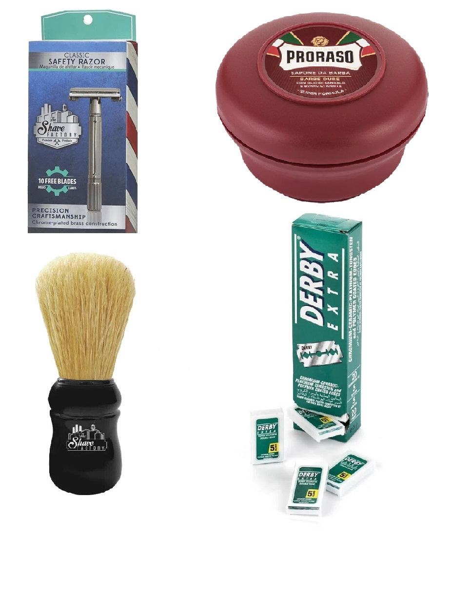 The Shave Factory Safety Razor Shaving Set with Proraso Sandalwood & Shea Butter Soap